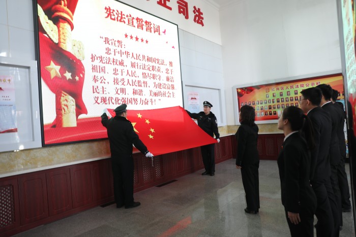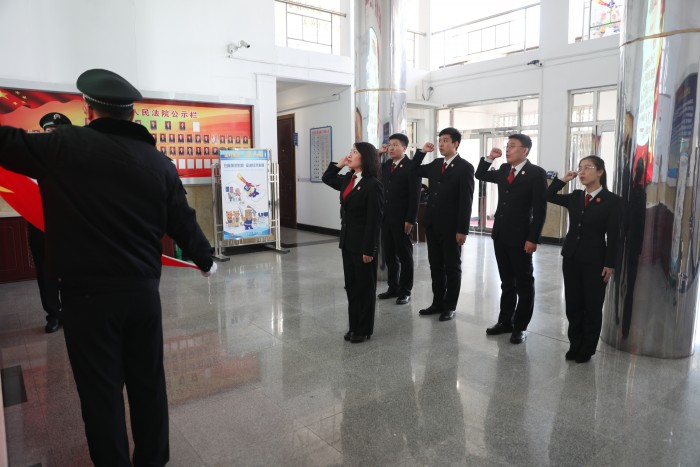 任命结束后,红岗法院举行新入额法官宪法宣誓仪式。“我宣誓:忠于中华人民共和国宪法,维护宪法权威,履行法定职责,忠于祖国、忠于人民、恪尽职守、廉洁奉公、接受人民监督……”在民一庭庭长、一级法官邱剑的领誓下,5名新入额法官向宪法庄严宣誓。