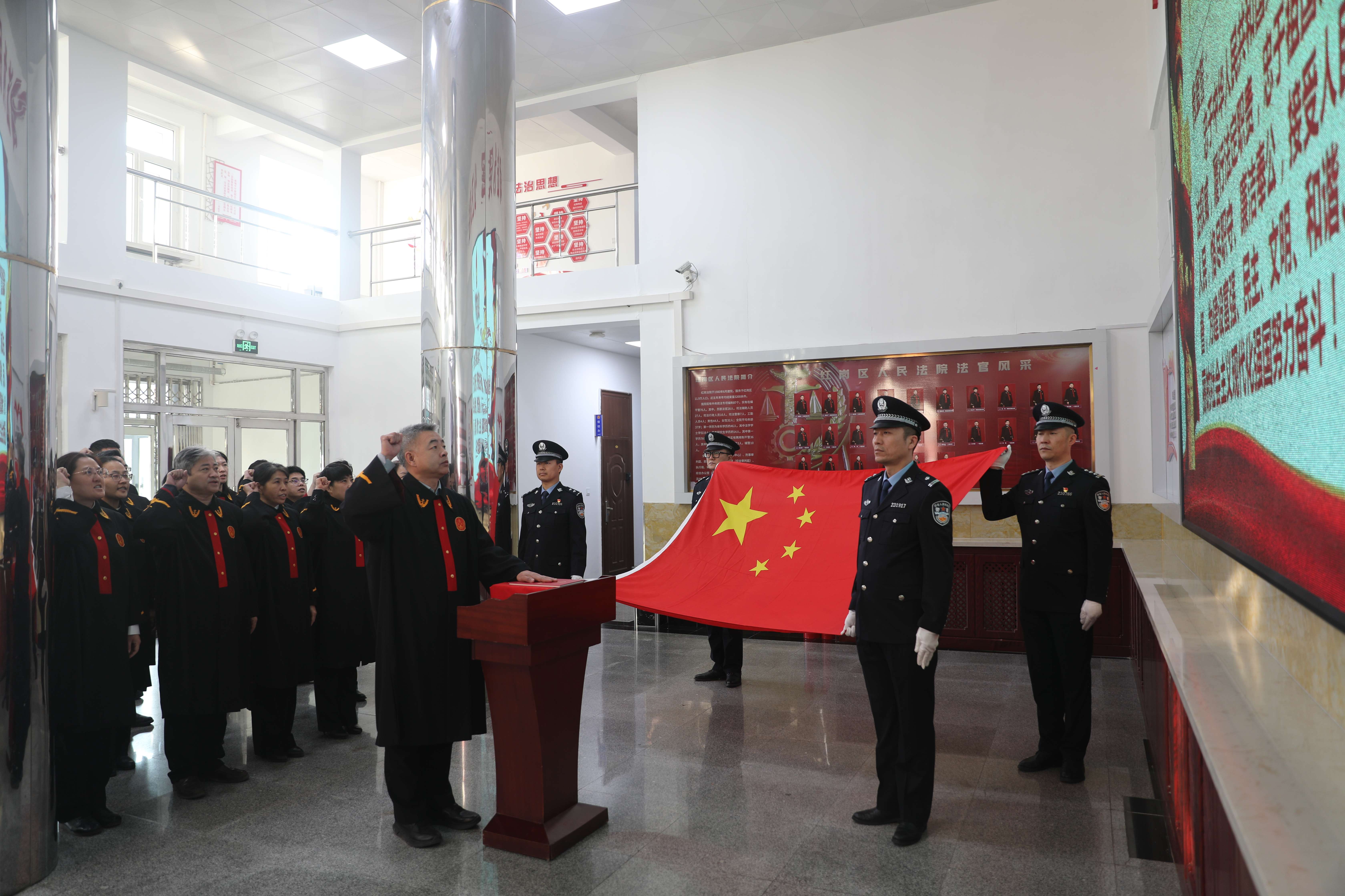 12月4日上午,红岗法院开展宪法宣誓活动。党组副书记、副院长穆永严领誓,全体员额法官以饱满的精神状态整齐列队,面向国旗,庄严许下对宪法的忠诚承诺,以赤诚初心践行新时代司法使命。